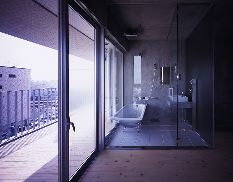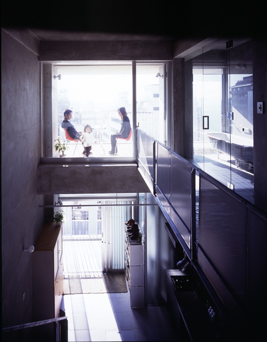 At the design stage of this project, it was found out that a fourteen-floored condominium was going to be built in adjacent to the north side of the site and a long-standing low-level market existed on the south.These facts helped us to predict that major environmental changes are unlikely in the near future and the existing wide view would be guaranteed for the time being.For these reasons, we decided to block the north side of the building, and place corridors, which usually do not function for any other purposes than passing, on the south.Facing the corridors, Soto Doma, outside exposed-concrete floor spaces are placed to substitute conventional terraces.In this project, while following legal regulations, the Soto Doma plays two roles of an entrance and a terrace at the same time to effectively use the limited floor area.It also plays a role as an intermediate territory leniently connecting common space and private space.Adjacent to the Soto Doma, two other different zones are set as Uchi Doma, which is an indoor free floor space, and a residential space.Being designed to be one uninterrupted space in the spatial constitution plan, the three adjacent zones are able to be divided or connected by installing/removing movable partitions and/or such fittings as glass louvers, lattice doors, and glass sliding doors.According to the will of the resident, the private and public spaces could be unified by combining the residential room, Doma spaces, corridors and the outside space.It could also be leniently segmented to secure his/her privacy.On SHH Project, I tried to create a spatial constitution where an architectural composition would not disrupt possible neighborhood communication, and enables the residents to have more freedom to modify various factors of their living.