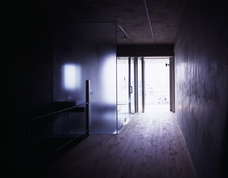 従来の形式化されたワンルームマンションとは異なる集住モデルをここでは考えた。また敷地は北側に接近して14階建てのマンションが建設されていて、南側には市場があり、当面開けた眺望が確保されていることも、この計画に作用している。今回、通行という機能以外はデッドファンクションとなる廊下を南側に配置し、その廊下と連続して、外土間、内土間、室という性格の異なるゾーンを設定している。各ゾーン間は連続した空間構成だが、引き戸や吊りパイプに掛ける可動壁を操作することによって、内部と外部の境界の強度を住民が決められる。ここではコミュニケーション、プライバシー、眺望など、集住にかかわる諸々のファクターについて住民が調整していくことが可能である。