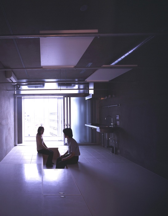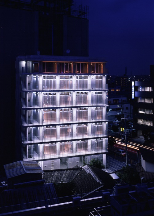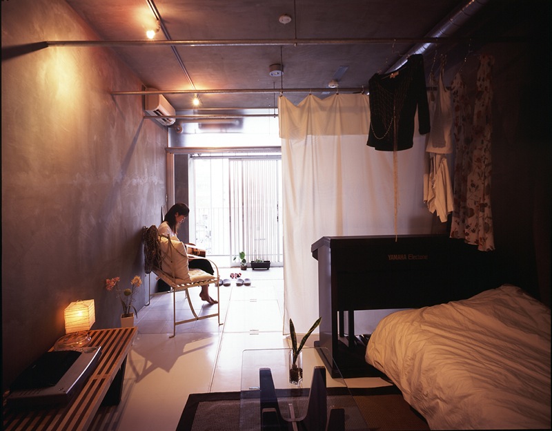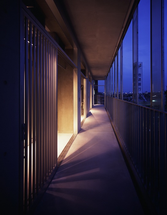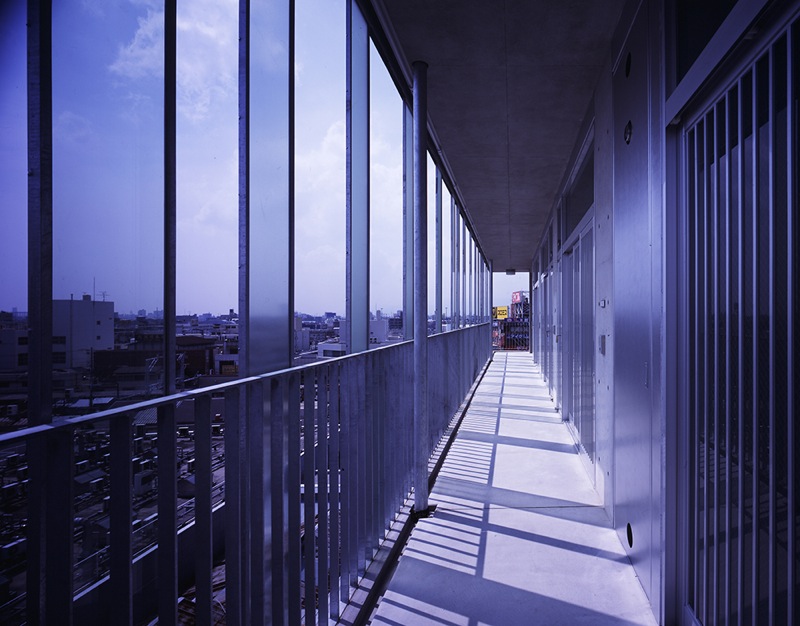 In Japan, most of one-room-system studio apartment houses are standardized, and they all look alike.The purpose to build them is too much profitability-oriented in most of cases, which consequently produces poor living environment such as extremely small floor areas and minimum ceiling heights.Designers and sellers of this type of apartment houses are so eager to gain the maximum possible profit from a limited area that they are interested only in how many rooms can be accommodated in one building.Most of them are planned to have corridors on the north and terraces on the south.The corridors, which are usually common portions, hardly have openings for the reservation of privacy and do not have any other functions than passage.With an about 90cm wide opaque door of each room facing this closed corridor, little communication happens between neighborhood, and actually it is not rare that neighbors do not know their names or even recognize their faces each other.