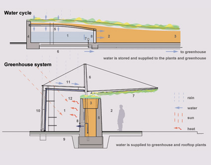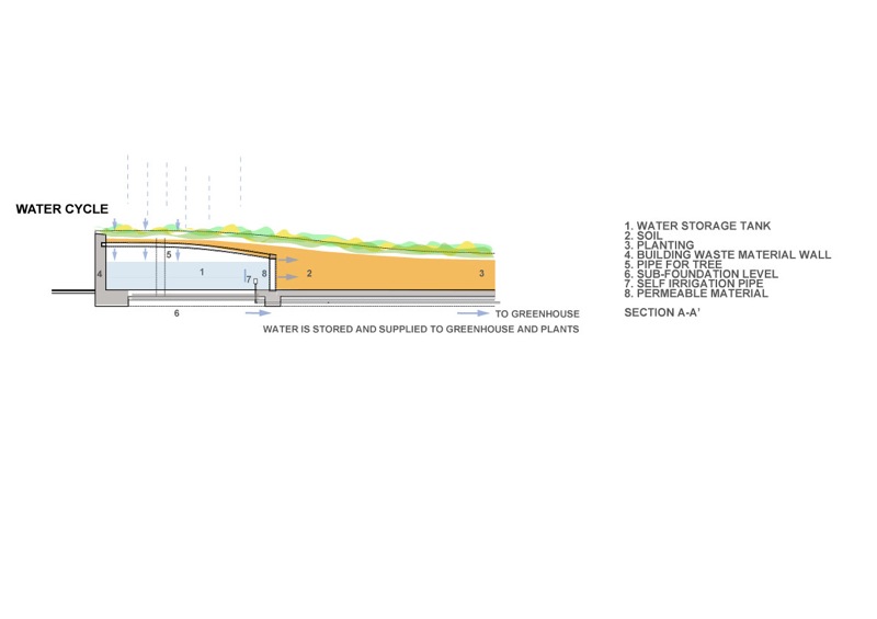 The water supply for the site is self sustaining and the irrigation process largely automatic. Water falling on the upper end of the wall is absorbed through a composite organic membrane and collects in a tank constructed of building waste and coated internally with a layer of cement. From the tank, water seeps through a vertical porous wall allowing a slow seepage of water into the adjacent soil while gravity drives water through a salvaged pipeline to the greenhouse, allowing for irrigation at the opposing end of the wall. Water to the toilet block is also supplied from the tank, from there the waste entering a staged grey water filtration bed system, irrigating the adjacent gardens.