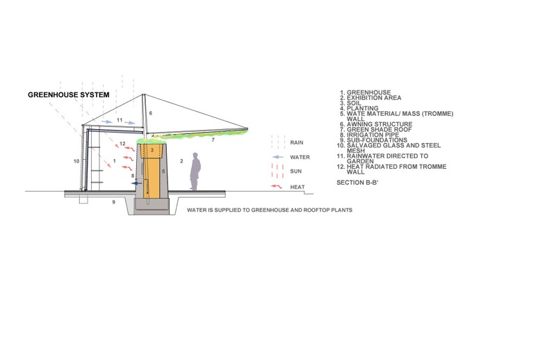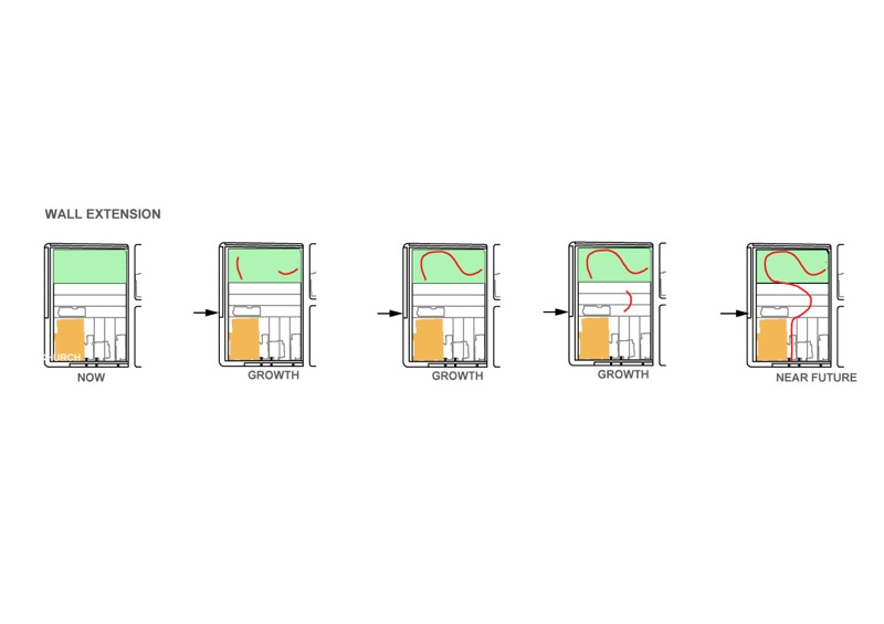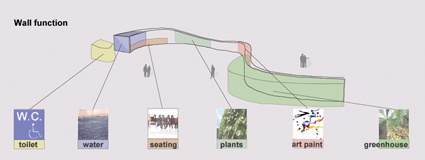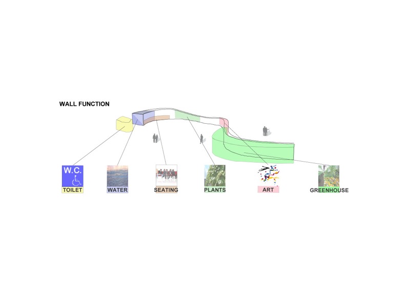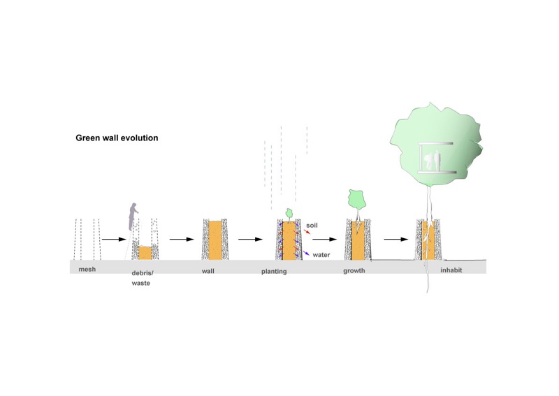 このグリーンウォールには世代を超えて様々な人々が関わり、壁面緑化、温室、貯水タンク、倉庫、根鉢、家具、基礎、ギャラリー等の環境的かつ建築的な機能が少しずつ生まれる。これらの諸機能の発生に伴い、人々のアクティビティーも序々に活性化し、年月と共に人々とこの場所との関係性がつくられていくであろう。
