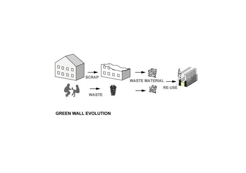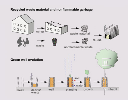 It is intended that the community at large engage in a combined construction and beautification effort, building the wall from building waste sourced from local sites combined with suitable waste material from the locale. Salvaged wire mesh binds the composite wall together and contains an inner core of soil and organic compost. The completed fabrication thus functions as an elongated planter allowing the sewing of vegetables, flowers and other desired greenery. Individuals are free to claim a segment of the wall for caretaking, in turn contributing to a singular greening wall ‘community’.