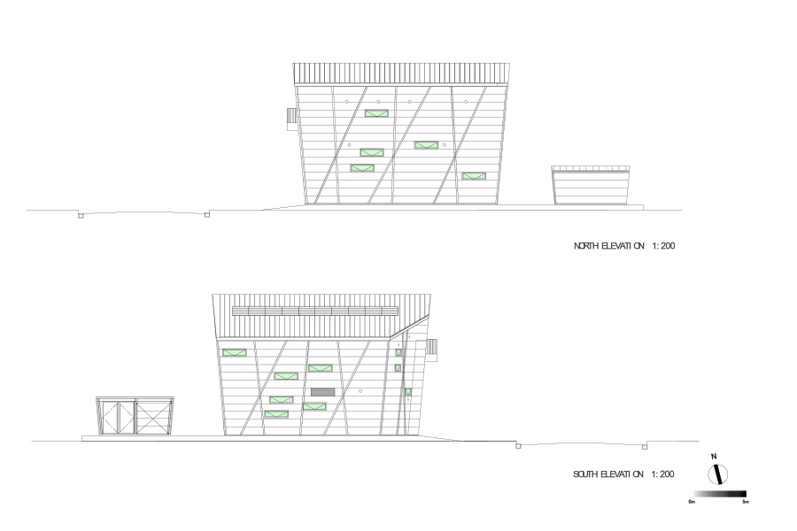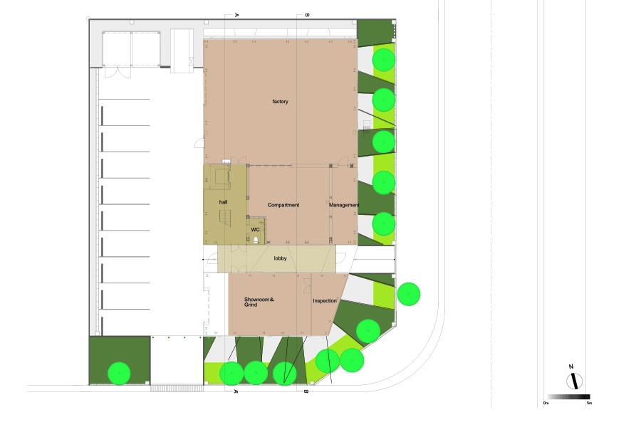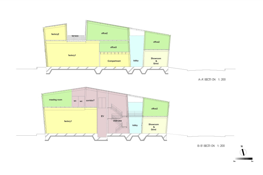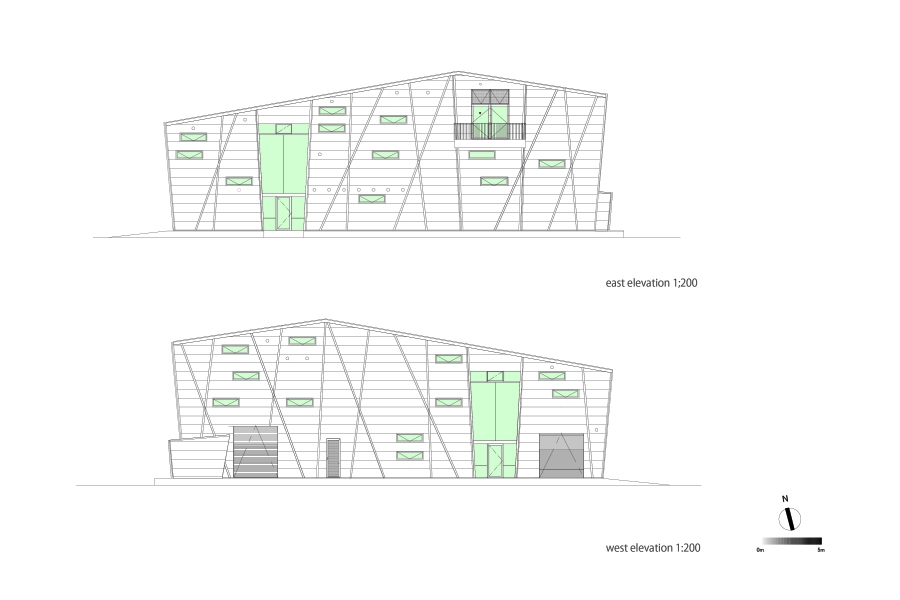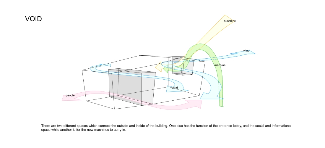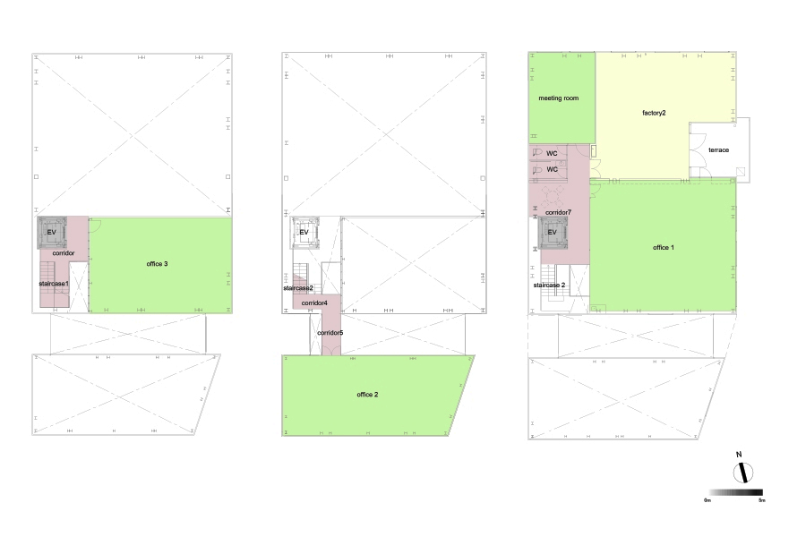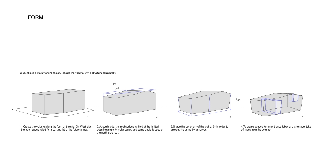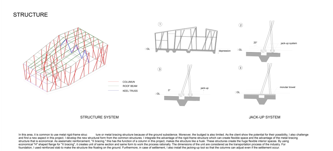 The client required to create spatially flexible, functionally easy for both office work and operations, and correspondence for ground subsidence. While all the requirements have to satisfy the client, I express the potential that the client has for its new business to run the top of the metalworking industry. As the result, I develop structurally new way to create huge space without wasting expenses; “X bracing columns” assembled on reinforced slab. The metal X bracing columns, aseismatic structure, is placed at periphery of the building. Combining this structural element with visual design, the expressive form and flexible and open spaces are successfully created. By assembling this form on the reinforced slab on grade, the building is like the floating ship. Even if the ground subsidence occurs, the structural columns have adjustable jack-up system. Two largely separated spaces are connected by the stairs through the atrium. These spaces, offices and workrooms are separated functionally, but still connected smoothly. The atrium has important connection between the factory and the community around the area. It is thought as the entrance of the factory while it is also considered as activity space of people. This project suggests the new meaning of the factory architecture as the materials characterize the factory, and the factory is not only the work place, but also the connecting place with communities.