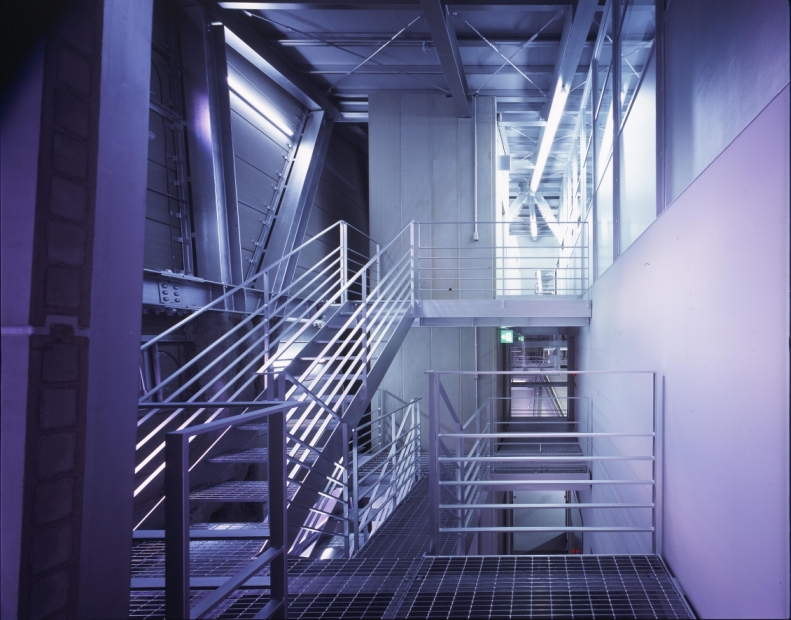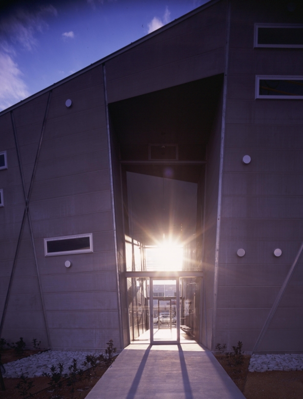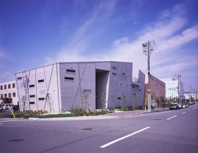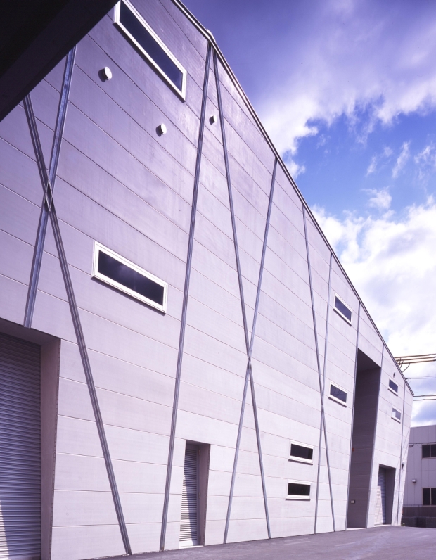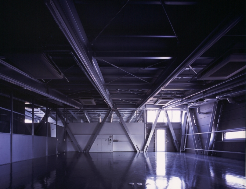 ポートアイランド内工場地域に新設する機械研磨工場。空間のフレキシビリティ、事務所機能と工場機能の連動性、地盤沈下への対応。要求をクリアし、新たな可能性へ挑戦するクライアントの企業姿勢を表現する様な、新しい構造形式が見出せないかを考えた。空間のフレキシビリティに富むラーメン構造と、部材断面が小さく経済的なブレース構造の特性を併せ持つX形柱を採り入れた架構とした。耐震要素であるX形柱を建物外殻に配することで、フレキシブルで開放的な内部空間の確保に努めている。確保した内部空間にヴォイドスペースを介したスキップフロアを持ち込み、各機能を有機的に構成している。また、埋立地における軟弱地盤対策として、剛強なマットスラブにより建物を船の様に浮かせ、地盤沈下による経年変化を想定したジャッキアップ可能な構造・構法を計画している。ローコスト、利用効率のみを優先する無機質になりがちな工場建築にあって、利用者、関係者を繋ぐ活力ある建築を目指した。