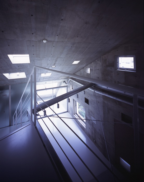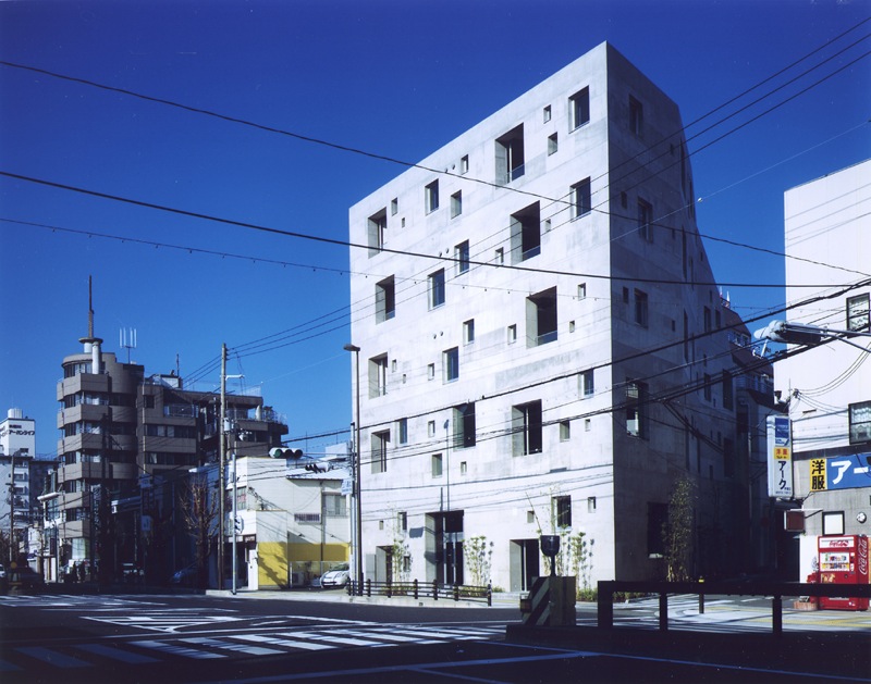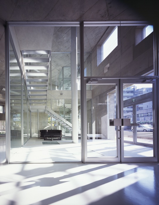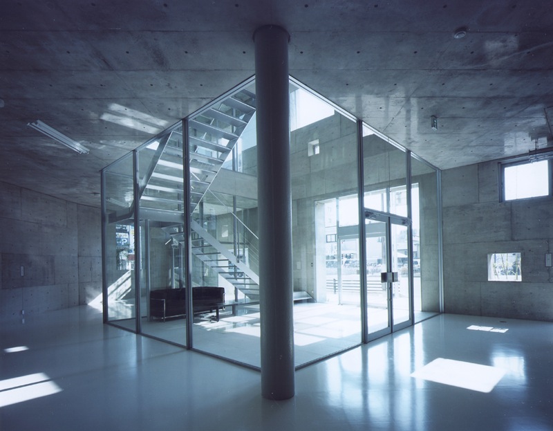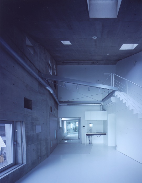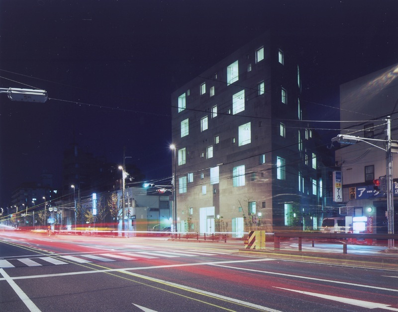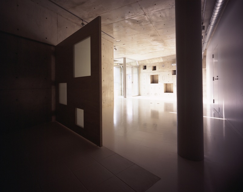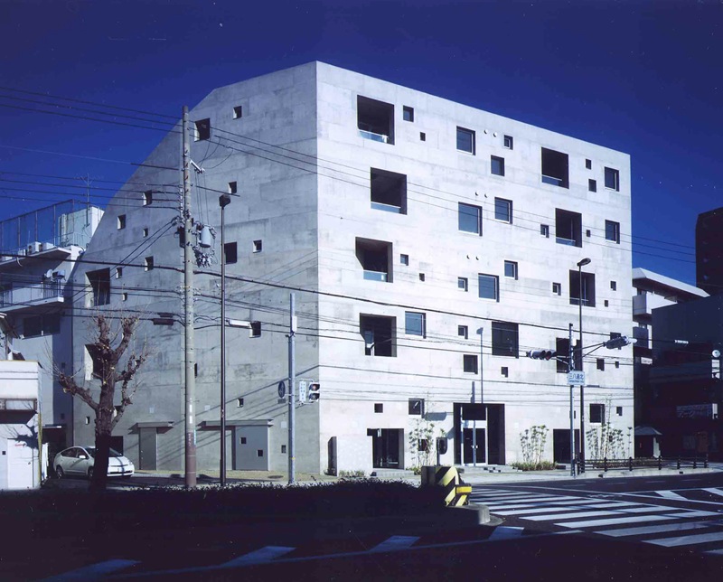 This is a project for building for rent including shop, office and SOHO on the site on National Highway 2 in Narihira of Ashia City. The frame line of the volume was determined by unique form of this site and special law of this site and repeated examination, and it was decided to give a limitation of slanted line. We tried to generate architecture like wild grotto which has been here for so long time by considering that volume from urban condition is unseeing form in urban space. We thought that the wall consist the outline of this volume by national road is important protection from noise of environment, additionally the wall works for earthquake-resistant construction with maximum width of 640mm of thick. Basically, there is no wall in interior of grotto to keep flexible space by only 4 columns to support weight from vertical direction then, each wall between tenant space is built up by method of construction at dry process. The float floor construction method by a reverse beam is adopted so that equipment apparatus, such as a position of a place equipped with a water supply, can be changed easily.On the surface of grotto, there are many various kinds of hole which make connection between inside and outside. User can send and receive natural phenomenon like light, wind and many information at everyday life at the open space around holes. Inside of some big size holes which are provided by the reason of law in size of 2mx2m are introduced to tenant space as a balcony. We guess that these terraces generate warp and pool in interior space and give user an opportunities of generating various kinds of activities. At On the surface of grotto, there are many various kinds of hole which make connection between inside and outside. User can send and receive natural phenomenon like light, wind and many information at everyday life at the open space around holes. Inside of some big size holes which are provided by the reason of law in size of 2mx2m are introduced to tenant space as a balcony. We guess that these terraces generate warp and pool in interior space and give user an opportunities of generating various kinds of activities. At the night time, sphere from inside of building is out to surrounding and light up Ashiya town warmly.