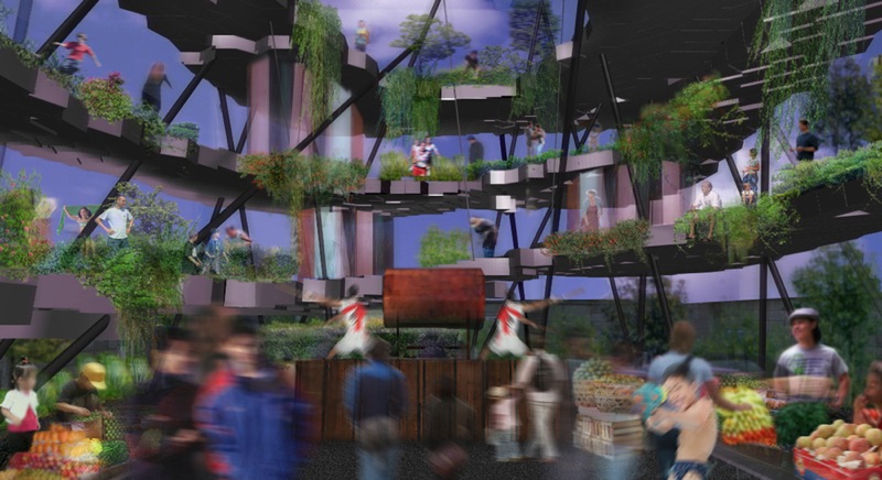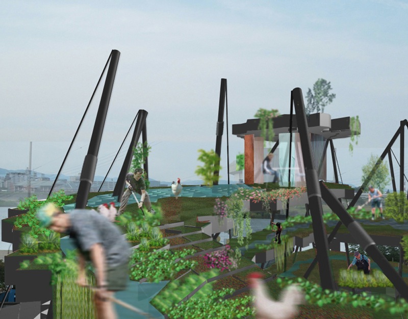 敷地は大阪市内淀川近くに隣接し、保育園が所有する。近年、マンションの計画もあったが諸事情により建設中止となり、現在駐車場となっている敷地である。この敷地の周辺地域は他の都心部と同様に空き家となった古い家屋の多くが壊され、代わりに駐車場へと変わってきている。この都市の隙間を埋め尽くす駐車場は、駐車という単一機能のみであり、街並みを退屈なものとしているのではないだろうか?この駐車場の敷地に、園児や地域住民が“農”と“エネルギー”の生産を行う“空に向かう人工地盤”「スパイラルフィールド」を提案する。