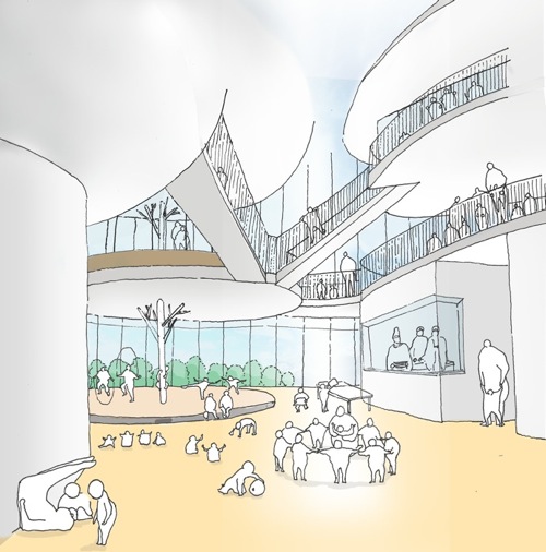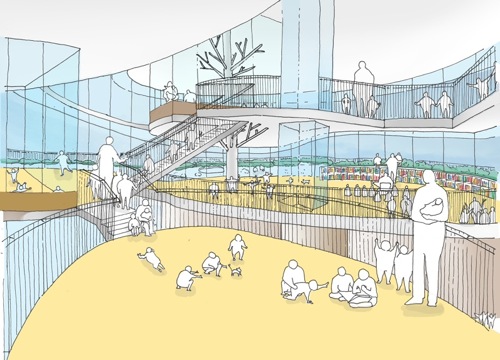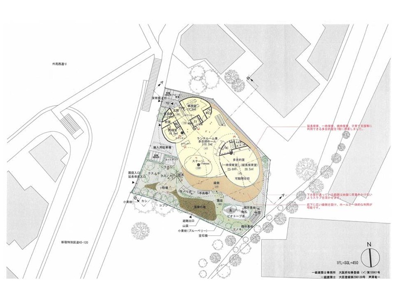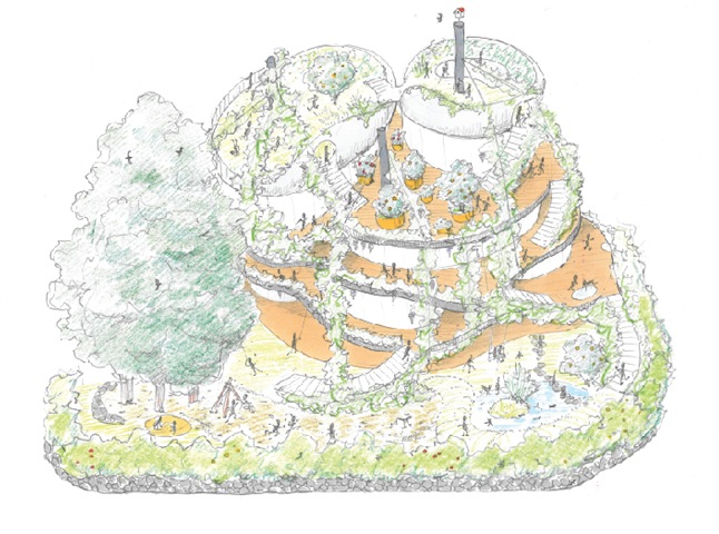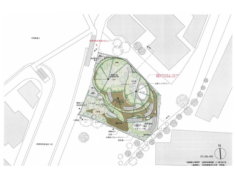 また地上の園庭から屋上までを連続させた人工地盤として考え、最上部で雨水を貯め、下部まで自然に流下する計画である。各所に果樹等の植栽を施し、ビオトープを形成する。