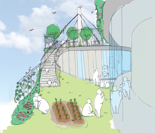 Moreover, it is think as artificial ground which from playground to the roof was made to follow, to collect rain water at the topmost part, and flow down naturally to the lower part. A fruit tree etc. are planted in every place and a biotope is formed.