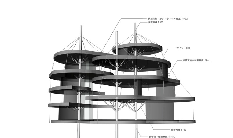 石垣に囲われた敷地全体が、森の様に樹木の落ち葉を貯め、腐葉土をつくる場として計画した。各階の床は幹柱から枝柱を出し、更に幹柱の頂部からワイヤーで吊り、幹柱は鋼管杭として地中まで連続して伸び、地熱を採熱する装置を兼ねている。