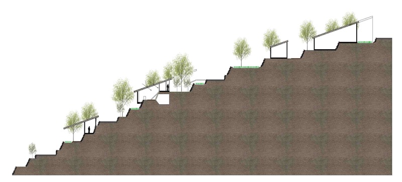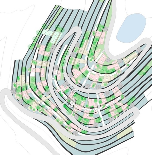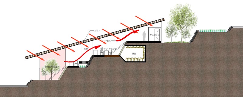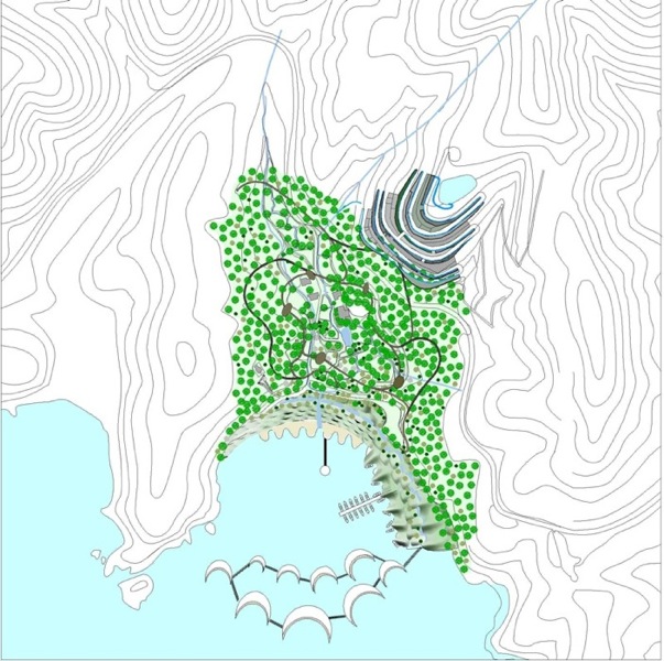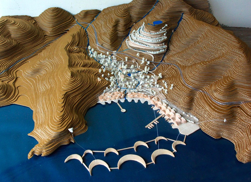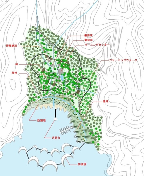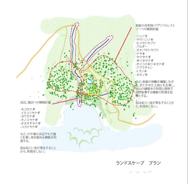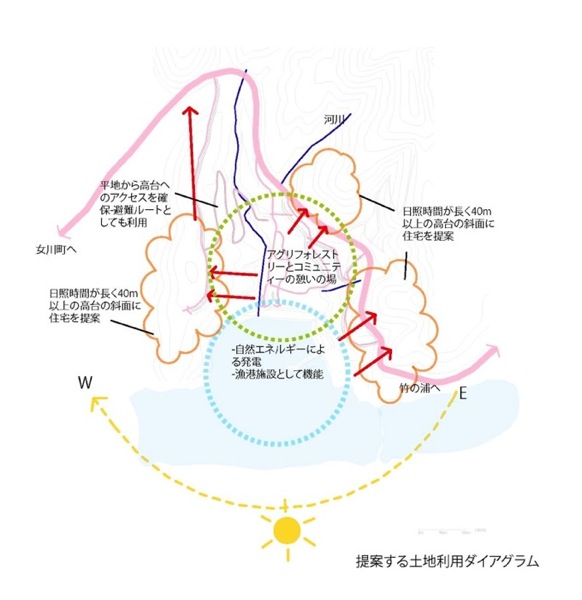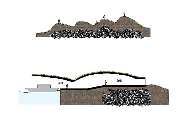 一方今回の震災で、低地平野部の都市は、ライフラインが切断されると無機能となる姿を露呈し、都市が持つ規模の大きさが必ずしも豊かさを伴わないことも明確になったのではなかろうか。エネルギーや食糧を自給していける小さな自立した漁村のコミュニティーのこれからのあり方を探りたい。リアス式海岸という自然が生み出した特異な地形を読み込み、エネルギーを生み出していく計画である。森を切り崩し、高台に家をつくることではなく、地盤が軟弱となった処置が必要な斜面地に地盤補強を兼ねた集合した住宅の計画を提案する。状況によっては幾つかの漁港を統合することを想定して分散的に配置することも可能な計画である。