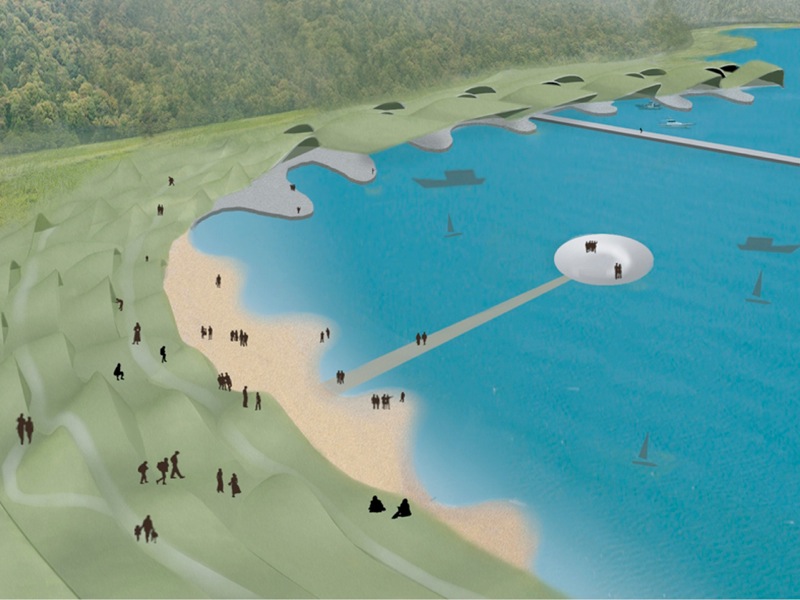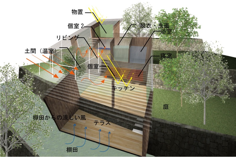 また集落内には、国内外からの旅行者が長期滞在できる宿泊スペースや都市との2居住拠点として数人でシェアーできる賃貸住居部なども持ち、高齢化して人口が減る漁村に新たな活気が生まれればと願う。