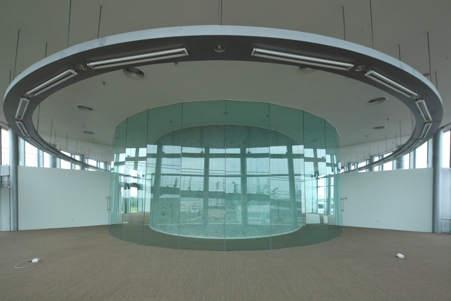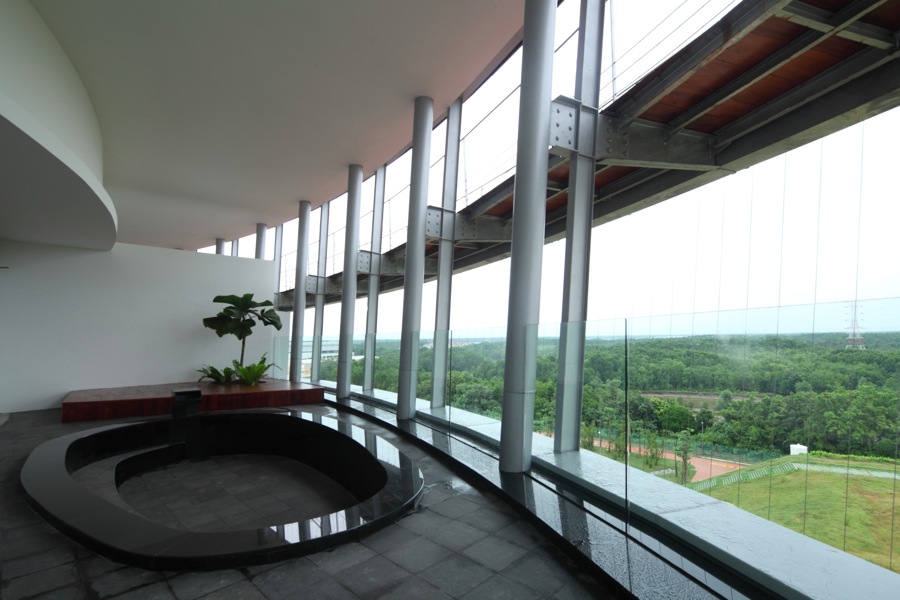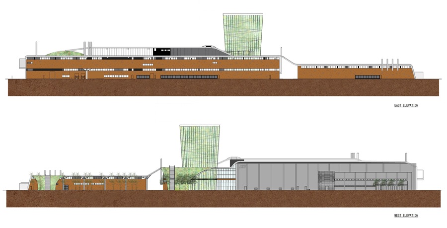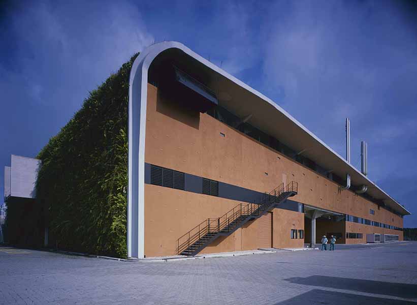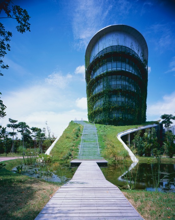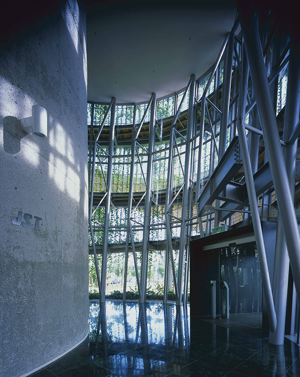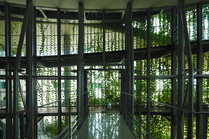 事務所機能を持つ高層棟は、楕円形の平面を持ち、その長軸方向を太陽の軌跡とほぼ同一の東西軸と一致させ、外壁面に対する日射の影響を最小化した。また高層棟の外壁の周囲に沿ってグランドフロア―から最上階まで、スタッフが歩ける連続するスロープを計画し、彼らの健康を向上させている。スロープの周囲に沿ってプランターを設け、上下にSUSワイヤーを貼り、蔓系の植物を育て、それらの垂直緑化は、内部への日射遮蔽の機能を持ちながら、高層棟を緑のファサードをつくり、このグリーンビルディングのシンボルとなる。また高層棟は建物高さを利用し、低層の工場棟全体の気流の流れを生みだす自然換気を促す役割を果たす。
