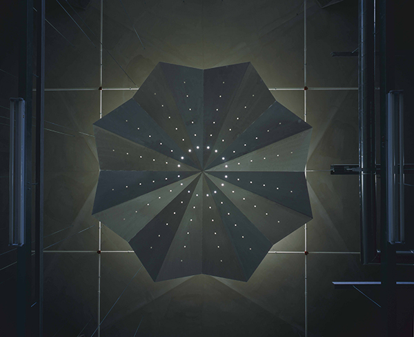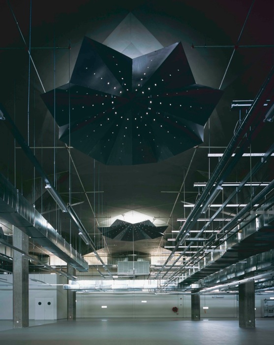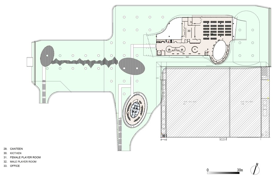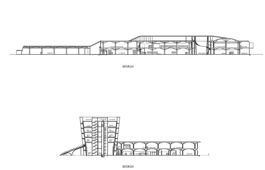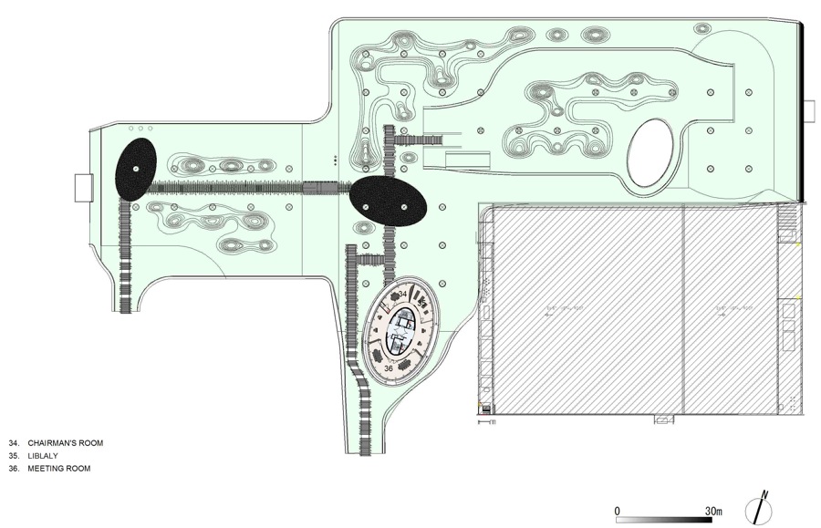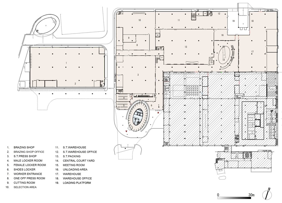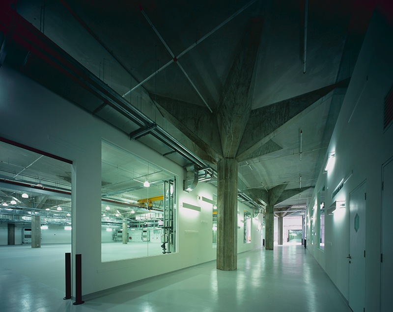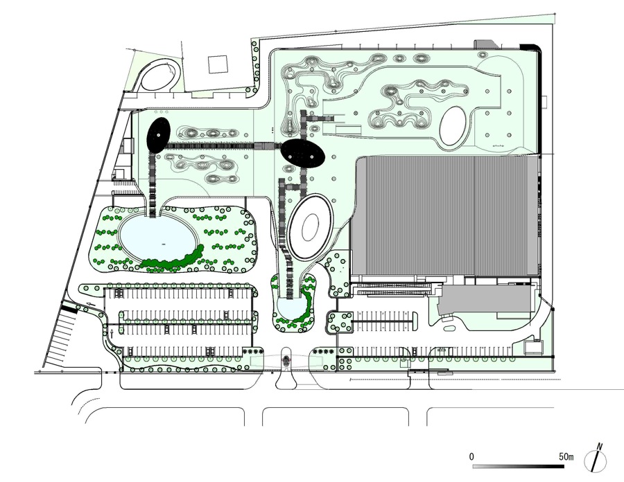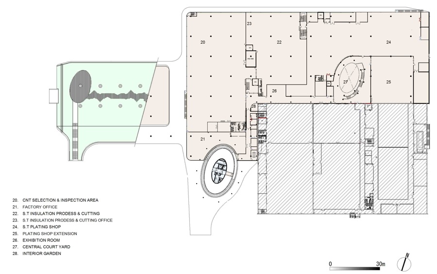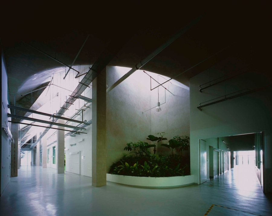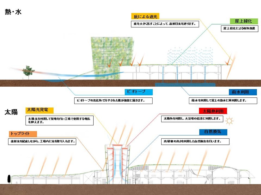 工場建築は、地表をめくるように大地と連続させた建築の大屋根の全面を緑空間として計画し、その下部に工場空間を挿入する。建物の屋上緑化は、工場空間の断熱性能を大きく向上させており、下部の工場空間は、頂部にフィンを持つコンクリート6角形柱を連続して配置し、スラブと共にイスラム圏特有のアラベスク紋様を描く様に計画し、ジャングルの森の様な空間をつくろうとした。屋上に降り注ぐ雨水は、植物の導管のように柱の中に埋め込まれた雨水配管によって、地下貯水槽に貯められ、植物の散水など循環的に利用されている。また屋上斜面に降り注ぐ雨水は池へと流れ込み、風が吹くと建築の半外部空間に冷気をもたらしてくれる。工場空間は、極力人工照明を低減するように、ハイサイドライトとトップライトによる反射光を計画し、トップライトを拡散させる反射板は、天井面にいかに均整に光を拡散させるかコンピューターシュミレーションによって導き、スラブと同様にアラベスクパターンを描く形態を持つ。