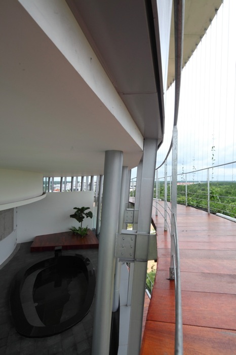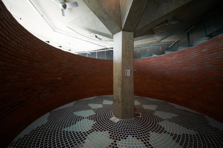 the roof soil works improving greatly the efficiency of the factory space insolation. The space below is structurally arranged by a forest of hexagonal shaped pillars with a star shaped top derived from the arabesque patterns from Islamic culture, a reference to the surrounding jungle. rain water that pours down the rooftop is pulled into and underground water storage tank through the pipes embedded in the pillars being used cyclically for plants watering. when flowing into the pond and the wind blows, the rain water that pours down over the rooftop slope, brings a cold breeze to the transitorial space between exterior and interior under the roof. To reduce artificial light as much as possible, the factory is designed to reflect the light that comes from above. Guided by computer simulations, we could predict the amount of skylight reflected and difused by a reflection panel that shares its shape with the arabesque patterns. A multistory building houses the offices, this building aligned with the east-west axis allows for a minimized effect of a solar radiation projected on its outer wall surface. The slab along the perimeter of the high-rise building is a slope that connects with the ground level a continuous walking path for the workers to practice exercise and improve their health. The façade is provided with a system of wired with vines, these vines shield from solar radiation by sharping a vertical green wall, this building characteristic. Natural ventilation is carried through the multistory building to the lower spaces thankfully to its high creating a current of air. Combining nature into itself and blendimg with its surroundings it’s the type of factory that can connecr with its region making use of rich environment.