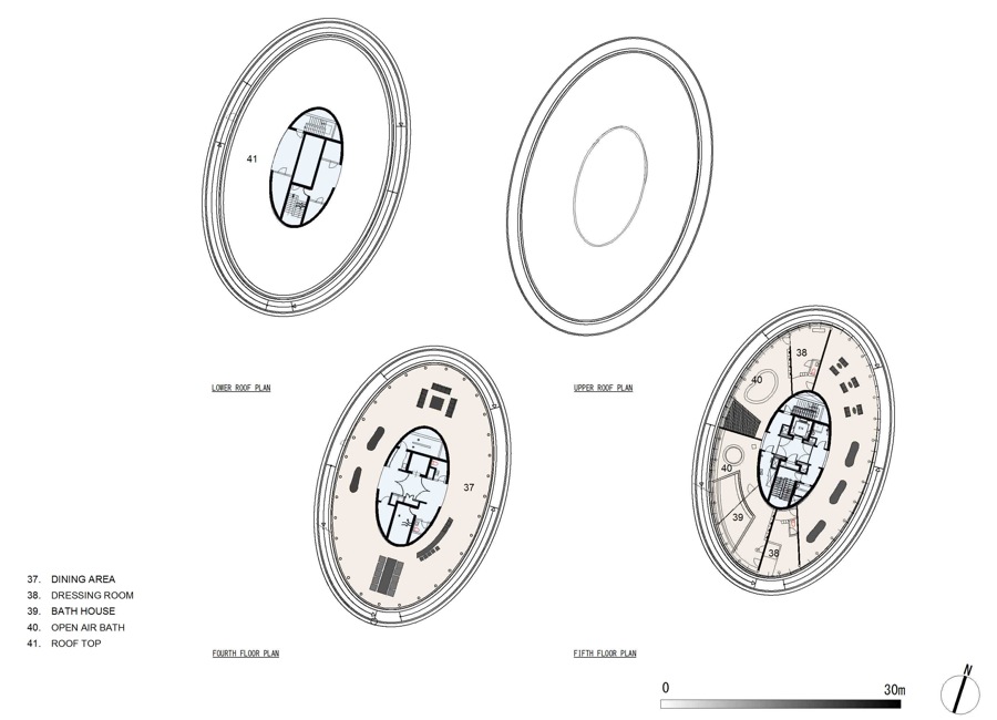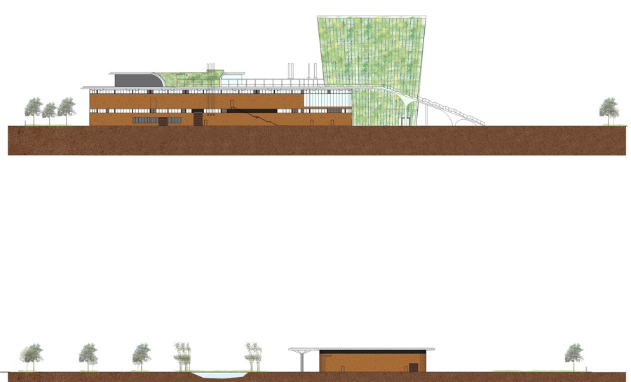 The plan intends to create a large green roof continuous with the ground extending the earth surface covering the lower functions and spaces.