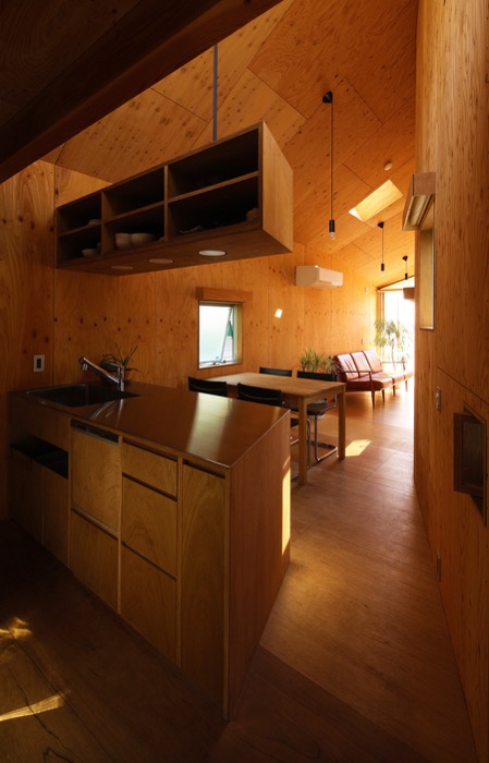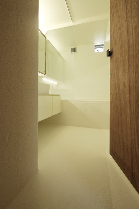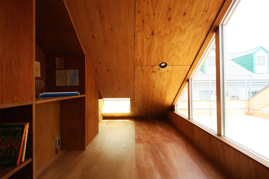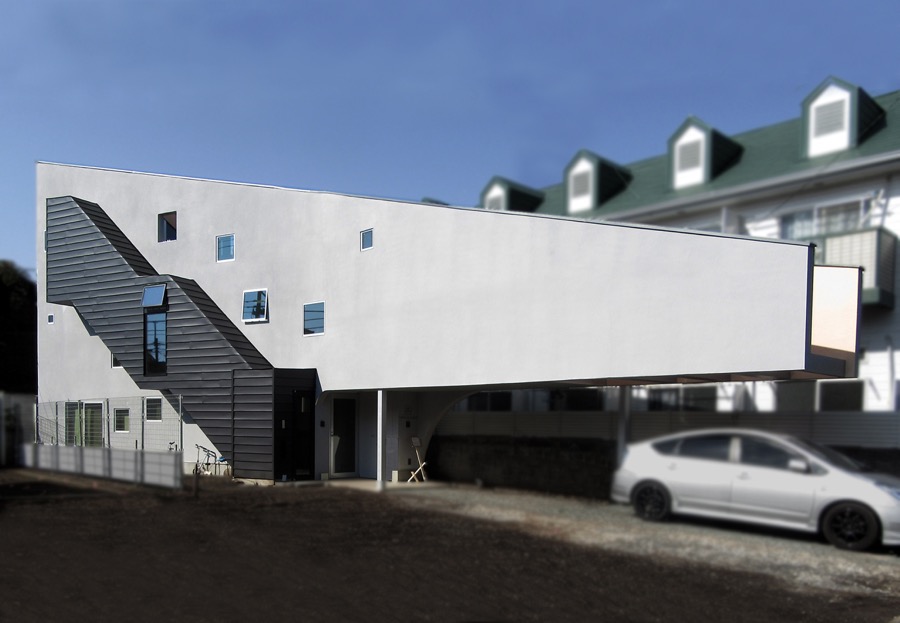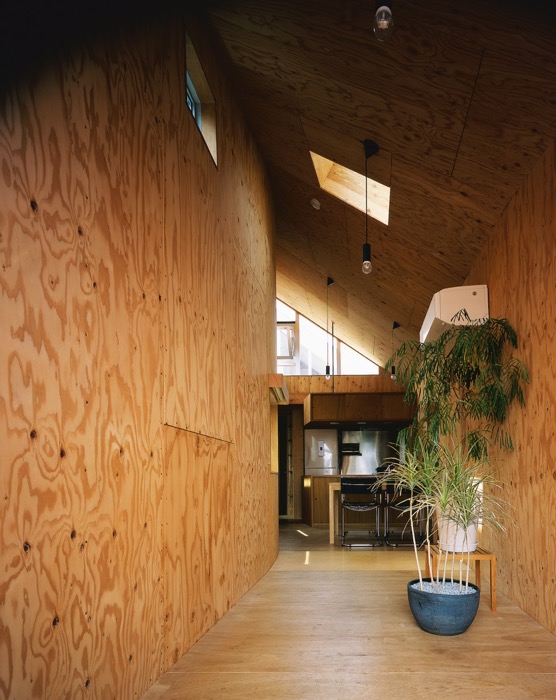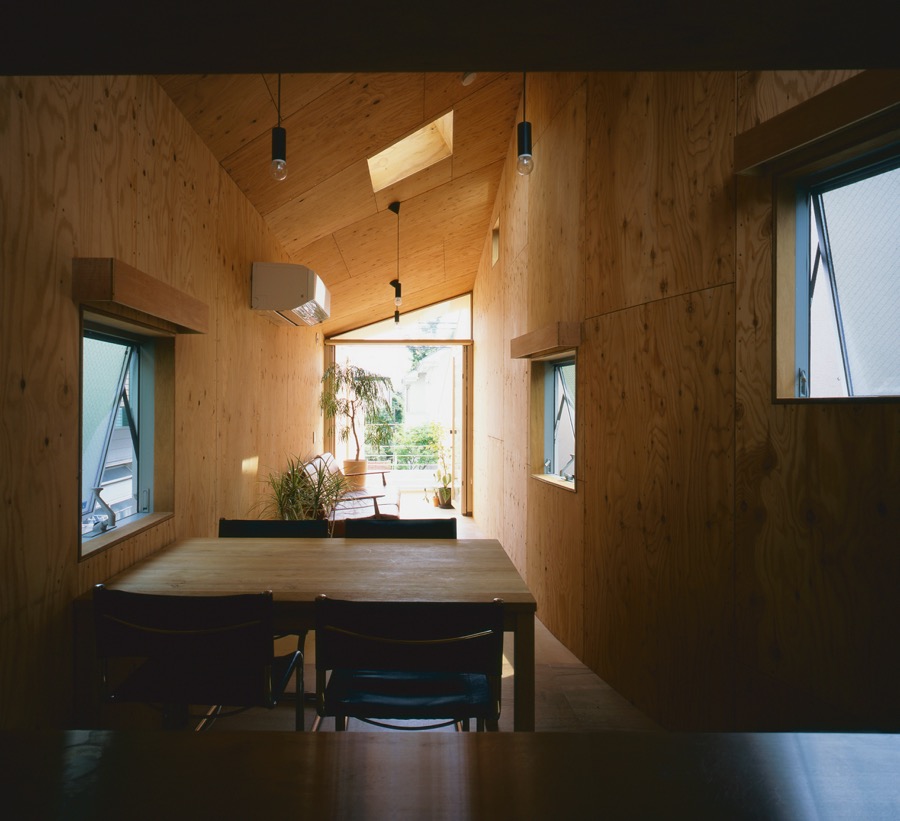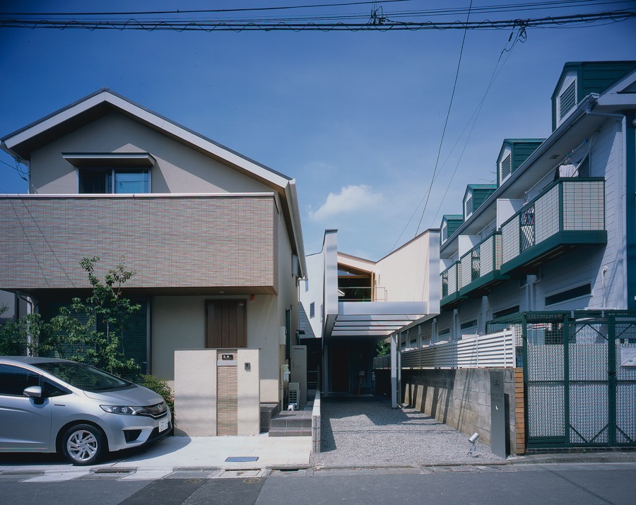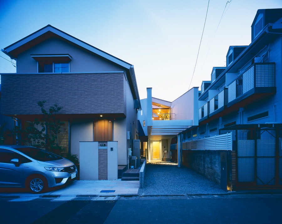 この住宅もまた相続のために敷地が分割され、約90㎡という⼩さな旗竿敷地における計画となった。現在まちに点在する「旗竿敷地」の特性を活かした建築空間を試みた。