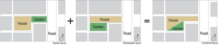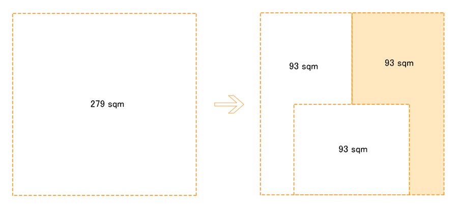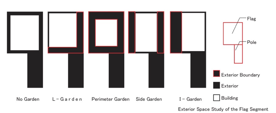 通常、この様な敷地は、旗に建築をつくり、竿は駐⾞場やアプローチ通路のみの利⽤となる。そして庭園や緑地スペースを確保することは難しい。