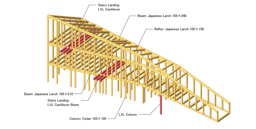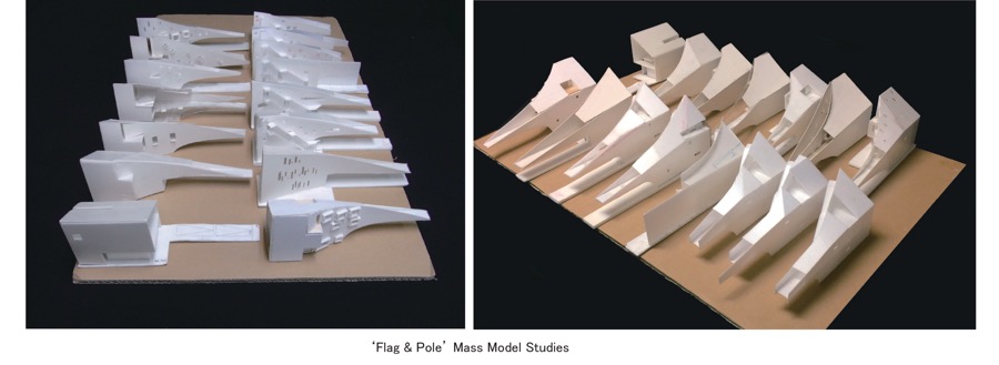 それにより旗と竿を⼀体としたかたちを導き出した。2Fのリビングは、キャンティレバーで竿いっぱいに跳ねだしたプライベートなテラス空間とつながり、向かいの緑地の借景を望むことができる。また旗は三⾓形状の建築ヴォリュームとなり東南に余⽩が⽣まれ、限られた⼟地に庭園や緑地を導いた。