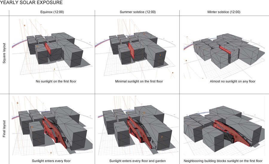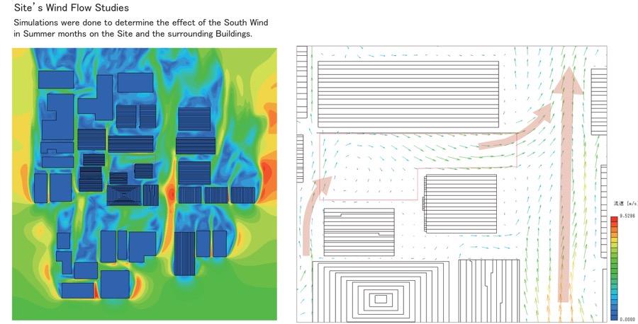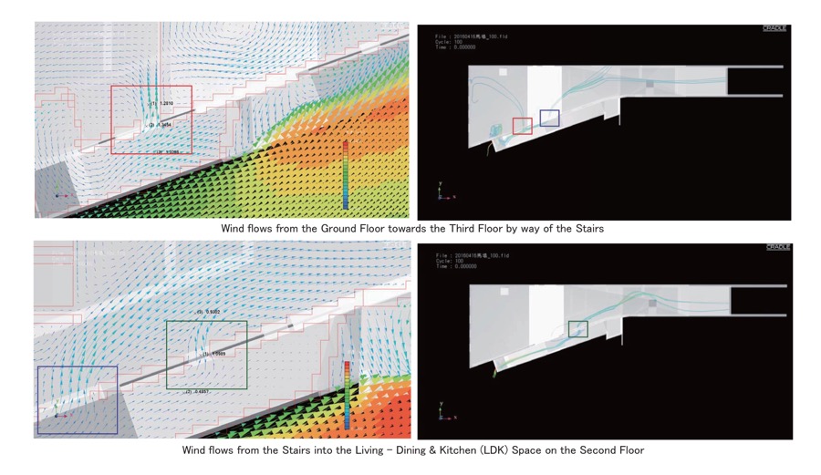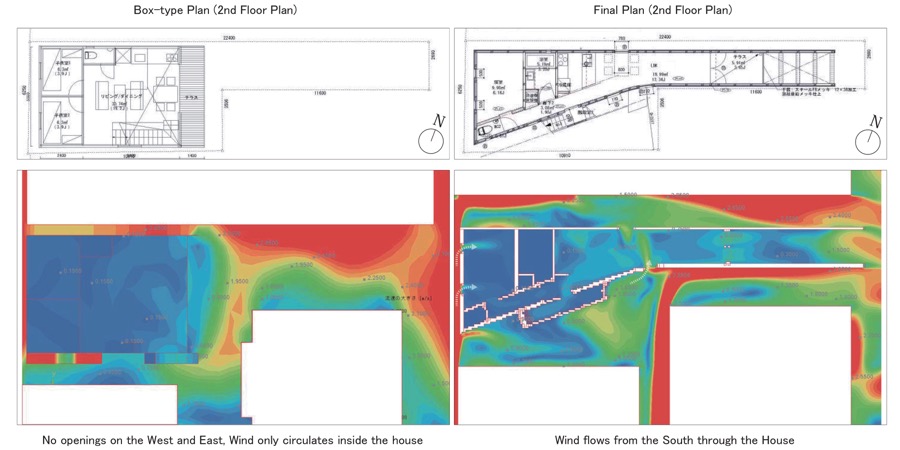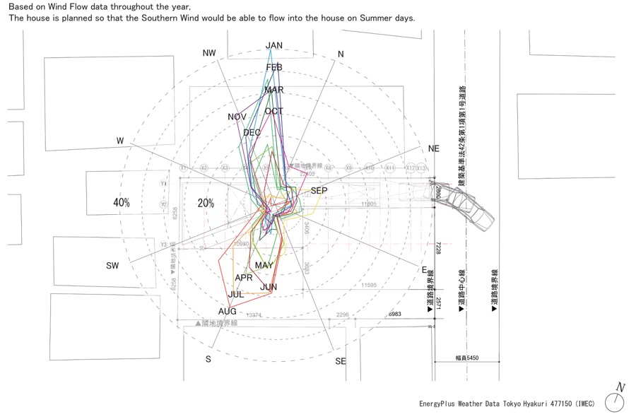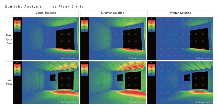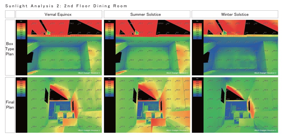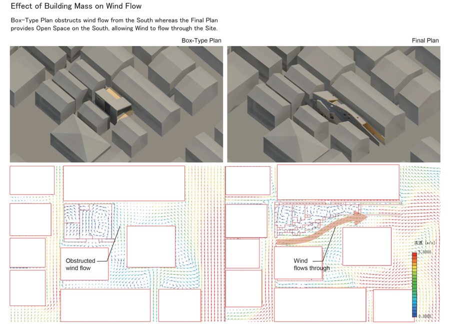 今回は、法的な制約や要求される居室のヴォリュームを検討しながら、密集地では得難い採光や通⾵を環境シュミレーションによってスタディを繰り返した。