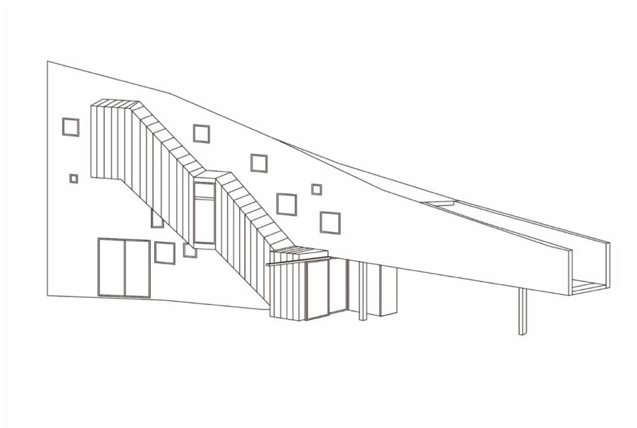 The resulting unique building footprint allows a space that harmonizes with the neighborhood green areas. Additionally, the living room on the second fl oor features a private terrace cantilevered over the narrow parking space.