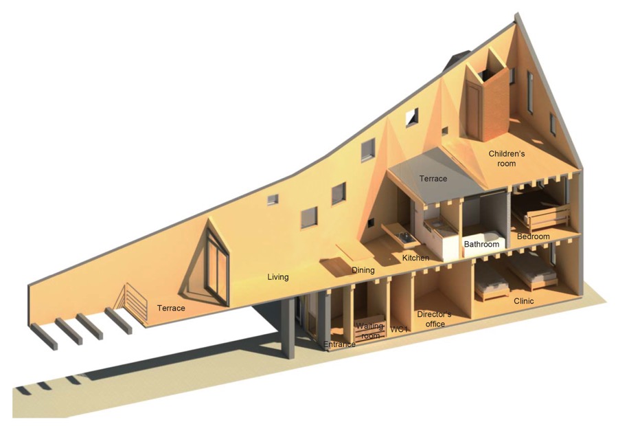 The program includes a clinic (located on the ground level) attached to the residence; the 90m2 plot (irregularly subdivided by land inheritance) is squeezed between the adjacent houses with only a 2.5m wide alley as access from the street. Usually projects with this site shape, use the fl ag part as building, while the pole part is used as for parking and approach. Opposed to this traditional solution yet complying with code and regulations, CFD simulation studies were performed to assess a shape that would profi t from natural light and ventilation.