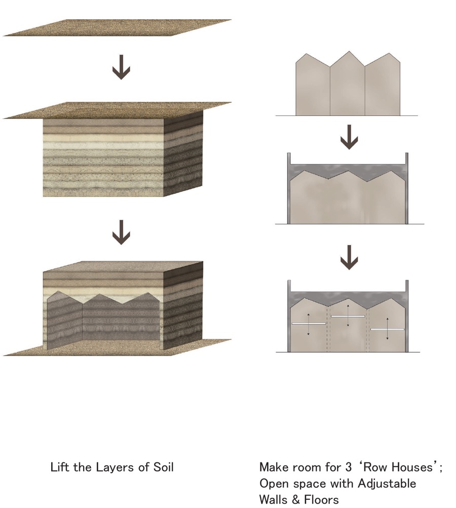 また⾼耐久性コンクリートの外壁は、周囲に対して⼟地の記憶を伝えるメディアとして考え、敷地の地層が地底より現れたような様相をもつ。その表⾯は実際の地層を模し、11種類の異なる層が重なるように表⾯処理を施している。