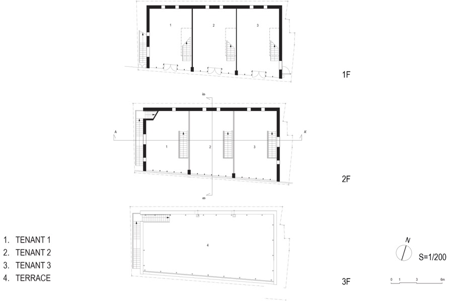 ⽇本⼀⻑い⼤阪の商店街、天神橋筋に近接するテナントビルの計画である。この商店街は、江⼾時代から続き⻑く商売の地としての歴史を持つ。そこで通常は短期間で消費されてしまう商業建築を今後最低200年は維持できる術を施主と共に思考した。