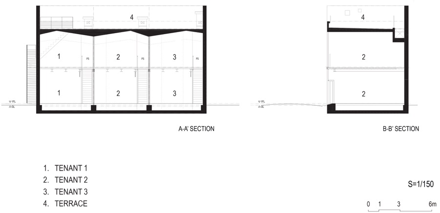 In order to preserve the history of the site -where three row-houses used to exist- the project proposes a two story building with space for three tenants. The shape of the building looks to inherit the characteristics of the context, by tracing the roofl ine of the three row-houses that previously existed.
