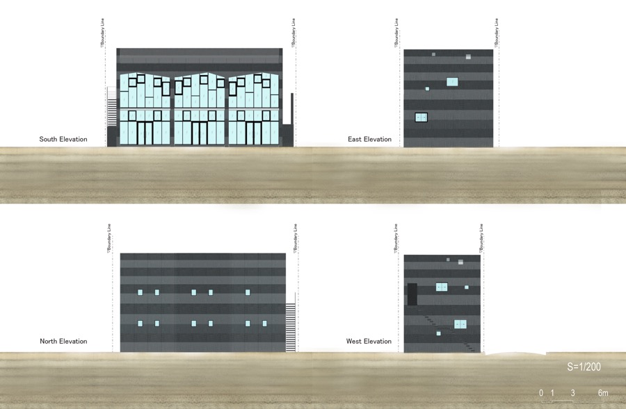 The exterior high durability concrete wall, besides working as a fi rewall, is a medium to convey the characteristics of the surrounding land. The surface texture looks to simulate the ground layer formation, with a coarse texture applied by different treatments, eleven layers in total. Surrounded by commercial facilities, this project is a long-lasting Architecture that pays re-spect to the historical commercial area called Tenjinbashi.