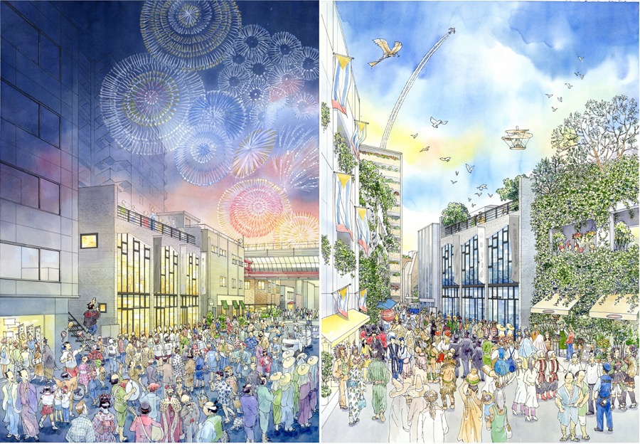 過去に存在していた3つの⻑屋の屋根ラインをトレースするように空間形状を定め、商業施設が密集している場所故防⽕壁という機能も持たせて、開放した道路⾯以外の3⽅の外殻を⾼耐久性コンクリートでがっちりと覆った。