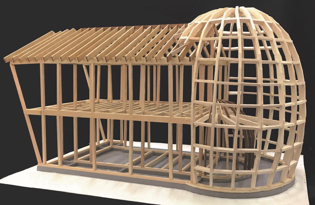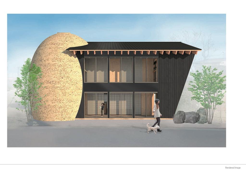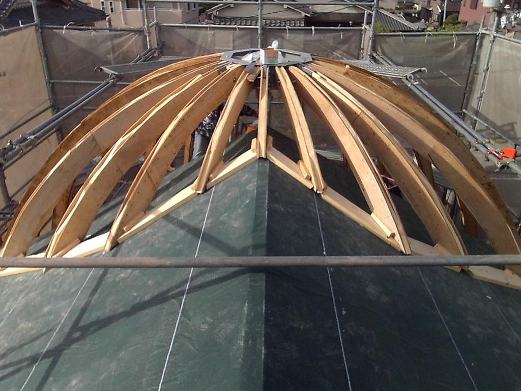 At first, bamboo was layered spherically, in which split bamboo were woven like a fence and a dome was made of soil, but the construction was quite difficult as it must be matched with the building standard. It had to be made of wood, but it was difficult to use something like curved laminated timber because of its high cost. As a result of trial and error on how to make a spherical surface with a straight wooden member, making a large bow-shaped “framework” by putting two pieces of short-cut wood together while shifting the cut and sandwiching it with a plywood board and fastening with screws was the adopted method. Then they were arranged radially to form the entire framework, a plywood board was attached, and a soil wall was used to form a strong cubic structure with only straight and flat members.