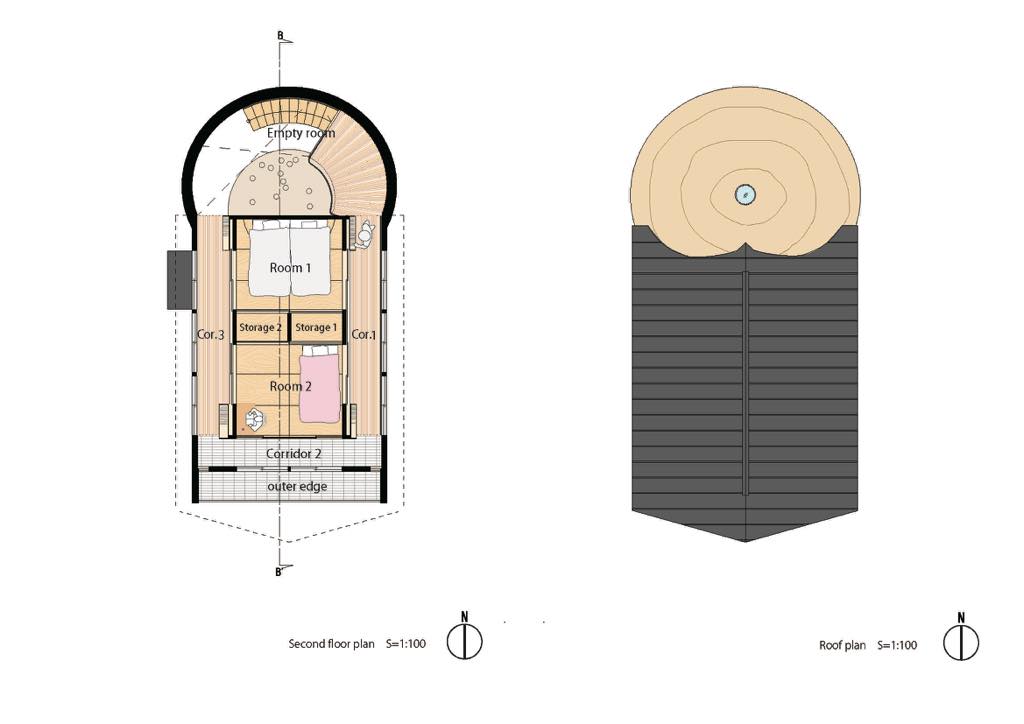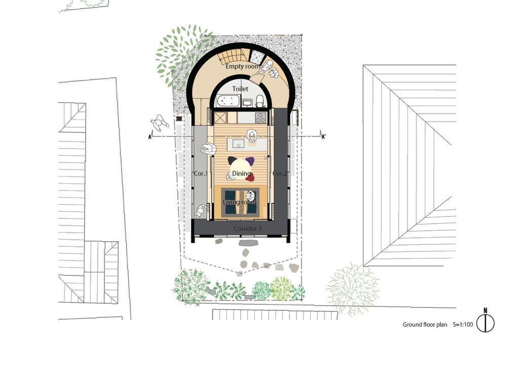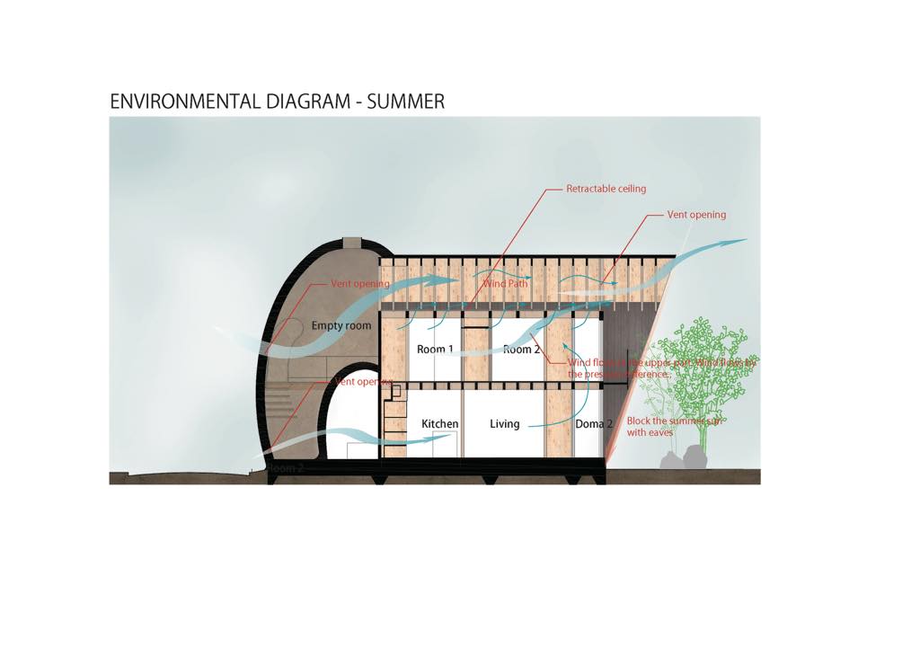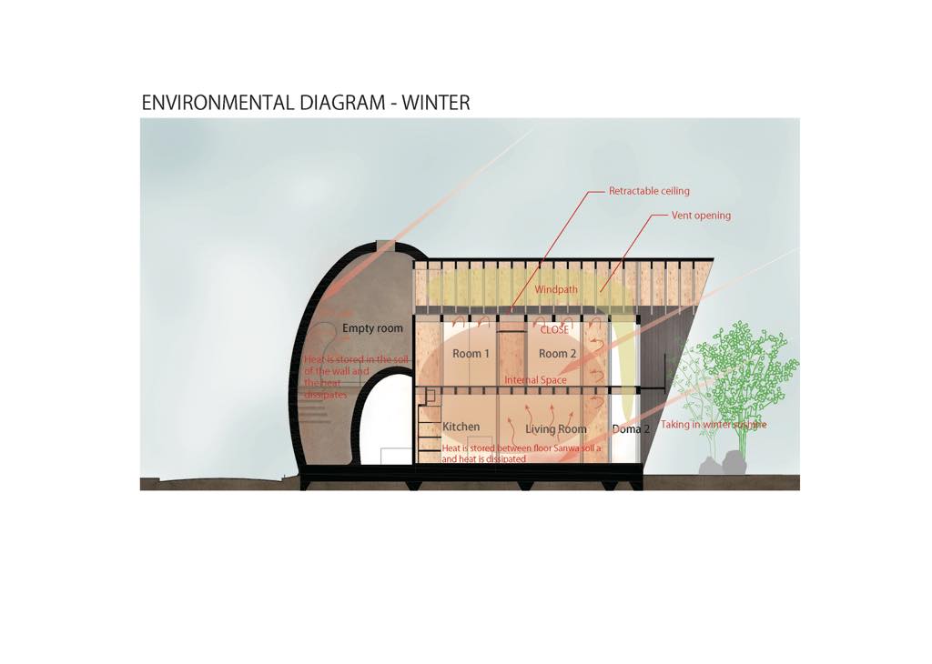 The living space on the south side has a double skin structure with soil and edges, and has various functions to adjust the environment. In the summer room 1F, the space between the ground and the length of the roof are examined so that direct light does not enter in the living room, and the fixtures can be adjusted in the north dome space and the south living space to create an indoor wind environment.