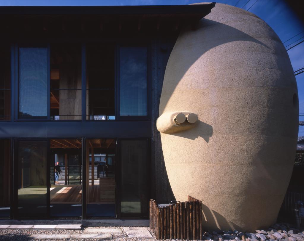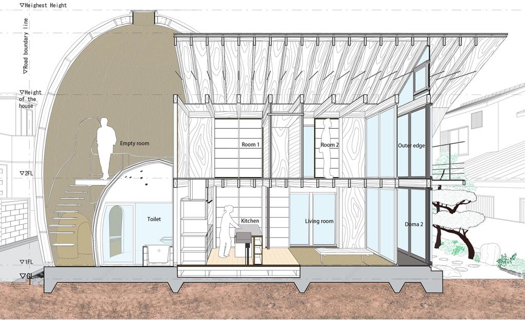 This house has an egg-like form, with a blowout space of 6.4m in height. The stairs connect the first and second floors, but the architect thought to create an empty space, that is, an "intermediate" space in everyday life. It also has two small dome spaces inside, a bathroom and a laundry room. In addition, The Otani stone fence of the dismantled existing house is reused as paving stones, while the plants that make up the originally existing gardens are basically left behind, and the sights such as stones are re-arranged and reused as shoe removal.