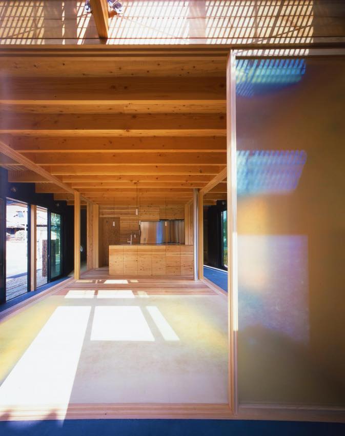 - 在来軸組木造による開放的な方形の生活空間を支える直線小径木材で