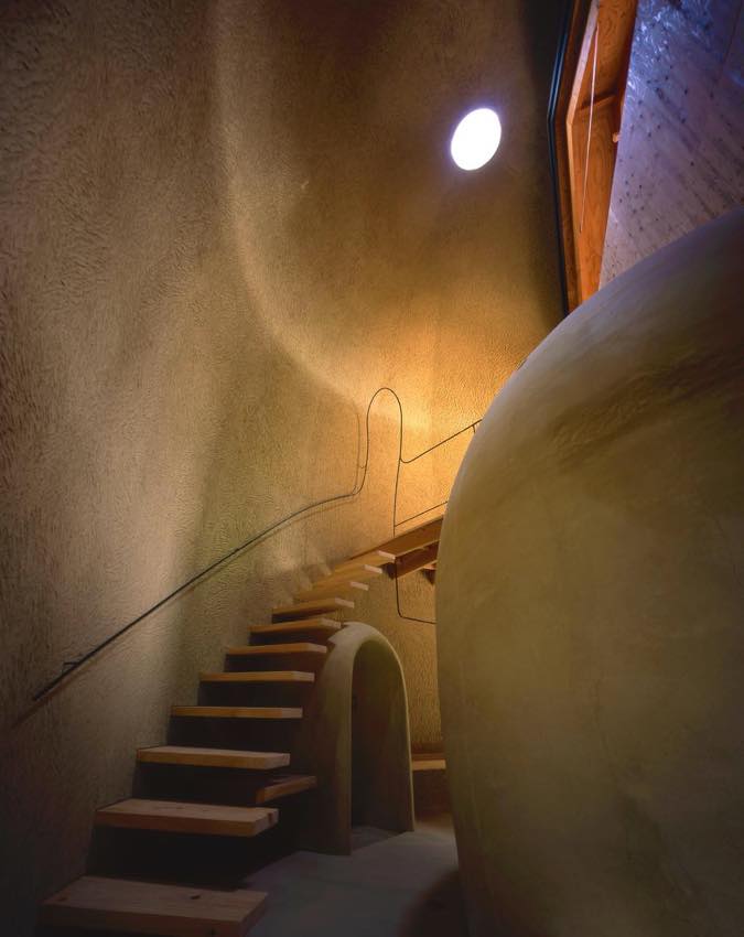 非日常空間は高さ6.4mの卵状のドーム空間で階段を内包しているが、日常の中に何もない空白をつくろうと考えた。内側にも小さなドーム空間を2つつくり、浴室そして洗濯室を配置している。身体や衣類を清めることもまた日常を切り替える「間」として考えた。この何もない間は、内外全てを土で仕上げを施し、内側は全面手叩きによって縄文土器のような表情をもつ。