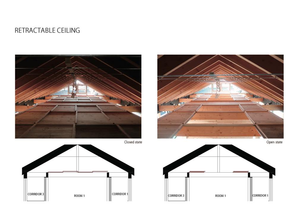 南側の生活空間は、土間や縁によるダブルスキンの構成とし、環境を調整する様々な機能を持つ。夏場の1Fの居間に直射光が入らないように土間スペースや庇長さの検討を行い、北側ドーム空間と南側生活空間で、建具を調整し、室内で風環境を形成することができる。冬場は、1Fの居間空間は直射光を取り込み、床の土間によって蓄熱し、さらに障子引戸を閉めることで外部環境に影響を受にくい室内環境をつくる。2階の室も、障子引戸と可動天井を開閉することで自然環境と関係性を築く室内環境を形成した。